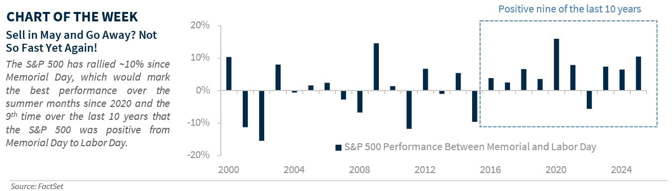 Don’t Worry, Be Happy! Heading into summer, markets faced a wave of uncertainty—from shifting tariffs and debt ceiling debates to questions around the fate of the ‘Big, Beautiful Bill.’ The challenges were hard to miss as the ‘wall of worry’ intensified. Yet, despite these headwinds, financial markets pushed through and even outperformed our expectations: the S&P 500 climbed 10.1%, while the Bloomberg Aggregate US Bond Index has added 2.7% since Memorial Day. Once again, this shows that the old adage, “Sell in May and go away,” hasn’t proven to be very accurate. But as we have noted in the past, staying invested—rather than timing the market based on seasonal trends—has historically led to stronger long-term results. Below, we break down this summer’s impressive gains and share our perspective on what we believe lies ahead for the broader equity market, sectors, and bonds.